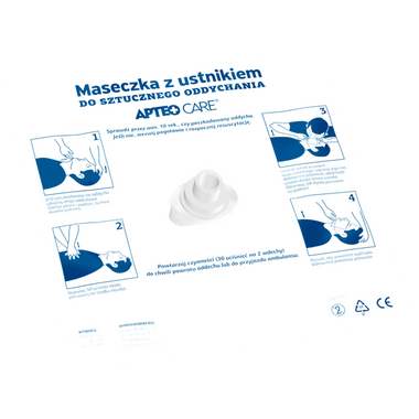 Apteo Maseczka z ustnikiem do sztucznego oddychania to wyrób medyczny przeznaczony do przeprowadzenia sztucznego oddychania w celu ochrony osoby udzielającej pierwszej pomocy przed zakażeniem krzyżowym. Stanowi ona barierę pomiędzy osobą udzielającą pierwszej pomocy a poszkodowanym.
