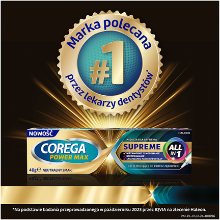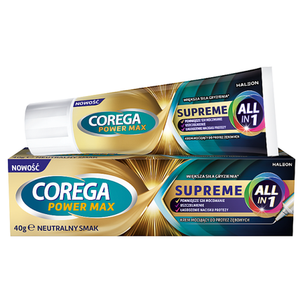 Corega Power Max Supreme to krem mocujący do protez zębowych całościowych i częściowych. Produkt utrzymuje protezy przez cały dzień, zapewniając komfort. Nie tylko stabilizuje protezę, ale także chroni dziąsła przed podrażnieniami i zapobiega przedostawaniu się resztek jedzenia pod protezę.