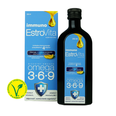 Preparat EstroVita posiada najwyższą skoncentrowaną zawartość kwasów tłuszczowych omega-3,6,9, które zostały wyizolowane z unikalnej mieszaniny aż czterech olejów roślinnych (lnianego, z czarnej porzeczki, wiesiołka, ogórecznika).