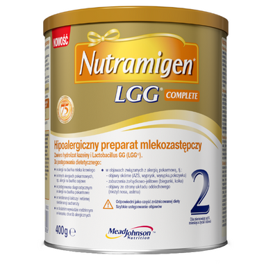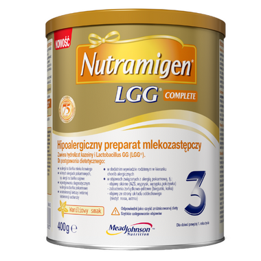 Nutramigen 1 LGG Complete: mieszanka na bazie kazeiny o wysokim stopniu hydrolizy odpowiednia do postępowania dietetycznego u niemowląt z alergią na białko mleka krowiego od urodzenia, może stanowić wyłączne źródło żywienia każda puszka mleka Nutramigen 1 LGG Complete zawiera 400 g preparatu zawiera LGG.