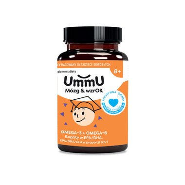 UmmU Mózg & Wzrok 6+ to suplement diety dla dzieci powyżej 6 roku życia. który wspiera pracę mózgu, prawidłową pracę serca oraz prawidłowe widzenie.